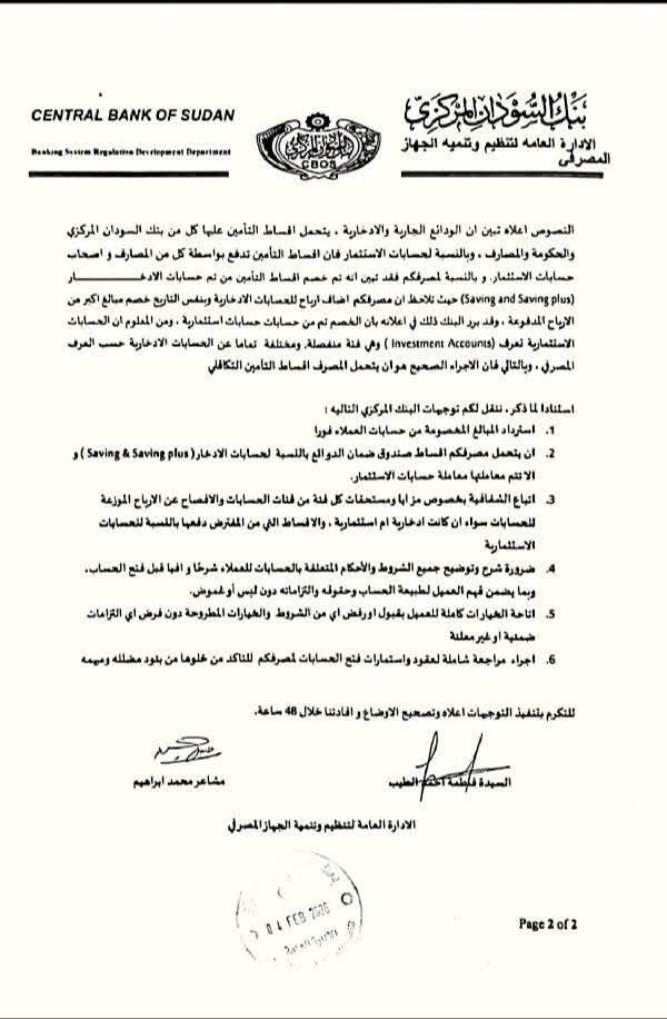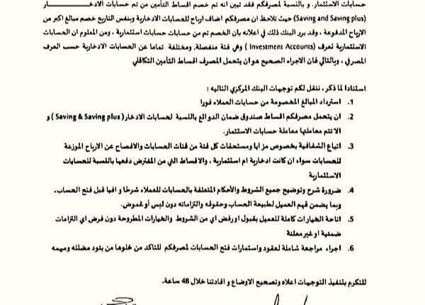 وجه بنك السودان المركزي اليوم بنك الخرطوم بإعادة ارجاع الأموال التي سحبت من العملاء فوراً على أن يتحمل البنك اقساط الودائع بالنسبة لحسابات الادخار، ودعا القرار بالعمل على تنفيذ التوجيهات وتصحيح الأوضاع والعمل على إفادة البنك المركزي في فترة أقصاها 48 ساعة، وطالب المركزي في منشور له بالشفافية بخصوص مزايا واستحقاقات كل فئة من الحسابات مع الإفصاح عن الأرباح الموزعة سواء كانت إدارية ام استثمارية والأقساط التي من المفترض دفعها بالنسبة للحسابات الاستثمارية.