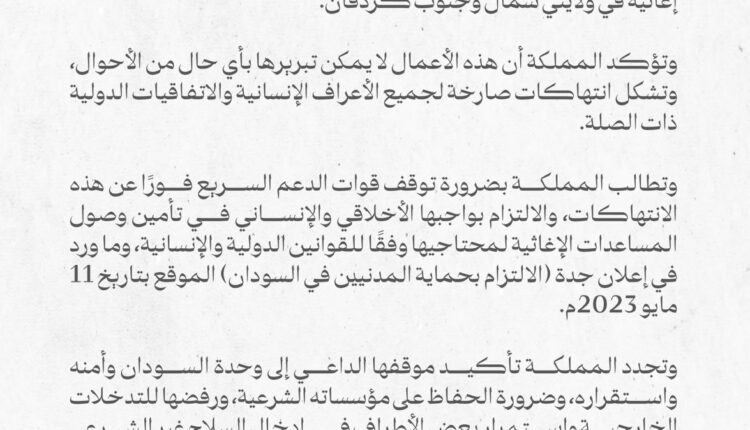 وطالبت المملكة بضرورة توقف قوات الدعم السريع فورًا عن هذه الانتهاكات، والالتزام بواجبها الأخلاقي والإنساني في تأمين وصول المساعدات الإغاثية لمحتاجيها وفقًا للقوانين الدولية والإنسانية، وما ورد في إعلان جدة (الالتزام بحماية المدنيين في السودان) الموقع بتاريخ 11 مايو 2023م.