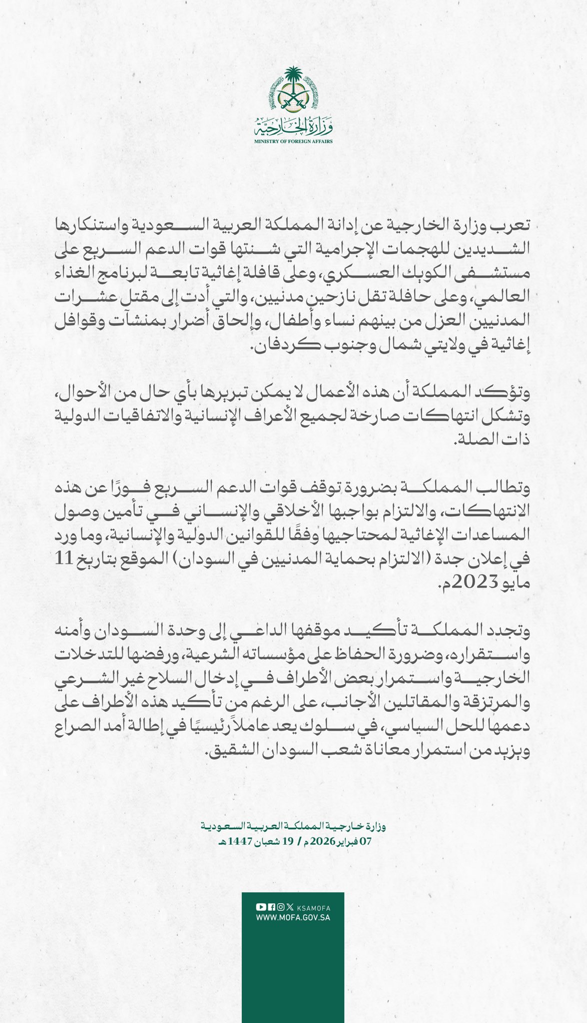 أعربت وزارة الخارجية عن إدانة المملكة العربية السعودية واستنكارها الشديدين للهجمات الإجرامية التي شنتها قوات الدعم السريع على مستشفى الكويك العسكري، وعلى قافلة إغاثية تابعة لبرنامج الغذاء العالمي، وعلى حافلة تقل نازحين مدنيين، والتي أدت إلى مقتل عشرات المدنيين العزل من بينهم نساء وأطفال، وإلحاق أضرار بمنشآت وقوافل إغاثية في ولايتي شمال وجنوب كردفان.