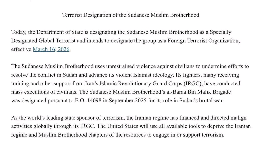 أعلنت اليوم وزارة الخارجية الأمريكية عن تصنيف جماعة الإخوان المسلمين السودانية كـ منظمة إرهابية عالمية مُصنّفة بشكل خاص، ونية تصنيف الجماعة أيضًا كـ منظمة إرهابية أجنبية.