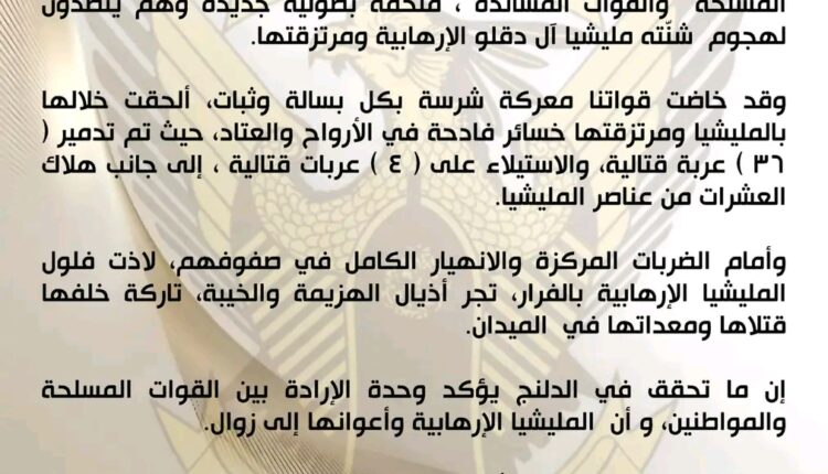 واعتبرت إن ما تحقق في الدلنج يؤكد وحدة الإرادة بين القوات المسلحة والمواطنين، و أن المليشيا الإرهابية وأعوانها إلى زوال.