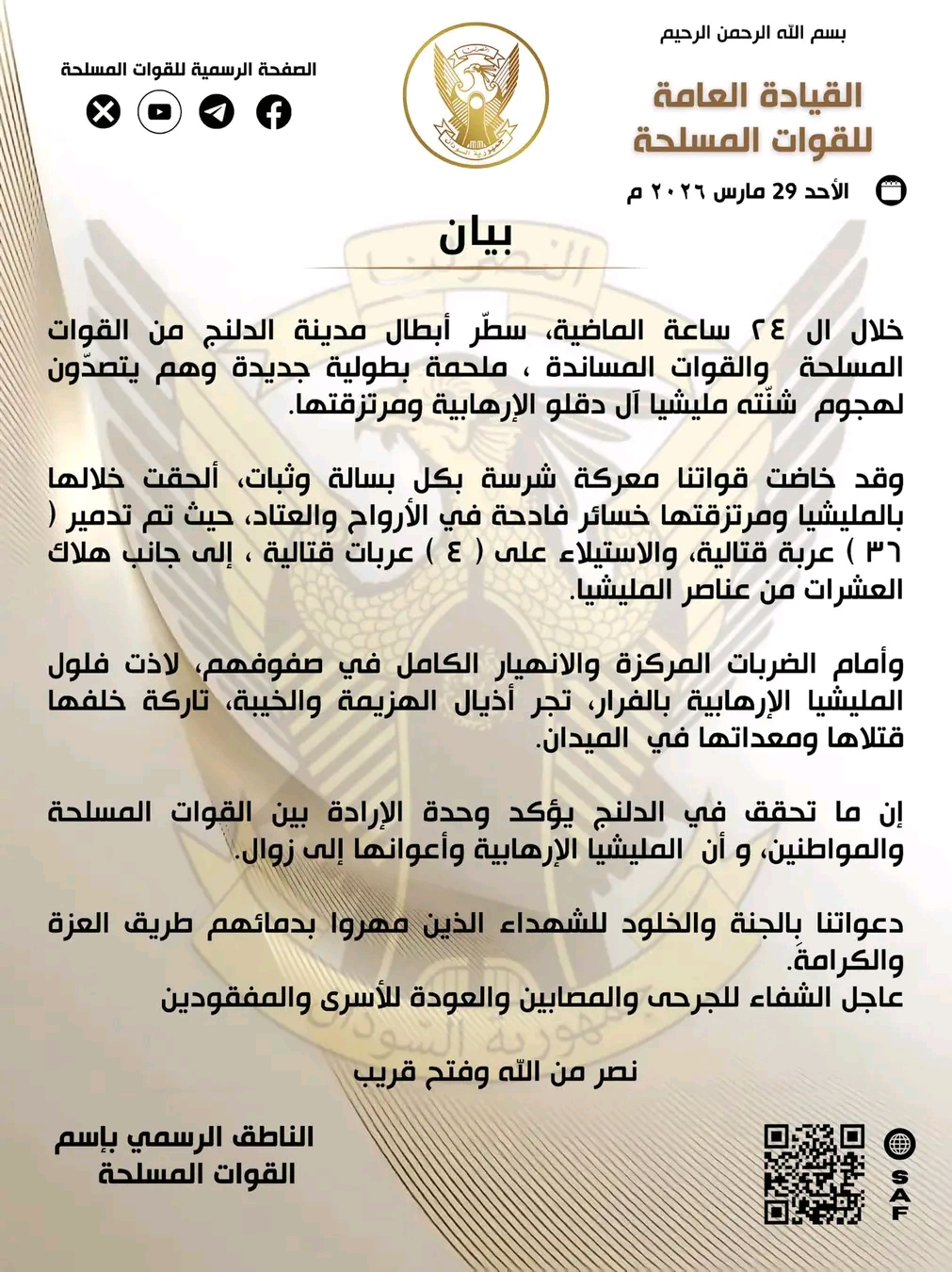 أعلنت القوات المسلحة اليوم عن تحقيقها انتصار جديد خلال ال ٢٤ ساعة الماضية، حيث سطّر أبطال مدينة الدلنج من القوات المسلحة والقوات المساندة ، ملحمة بطولية جديدة،واشارت إلى أنهم تصدوا لهجوم شنّته مليشيا آل دقلو الإرهابية ومرتزقتها.