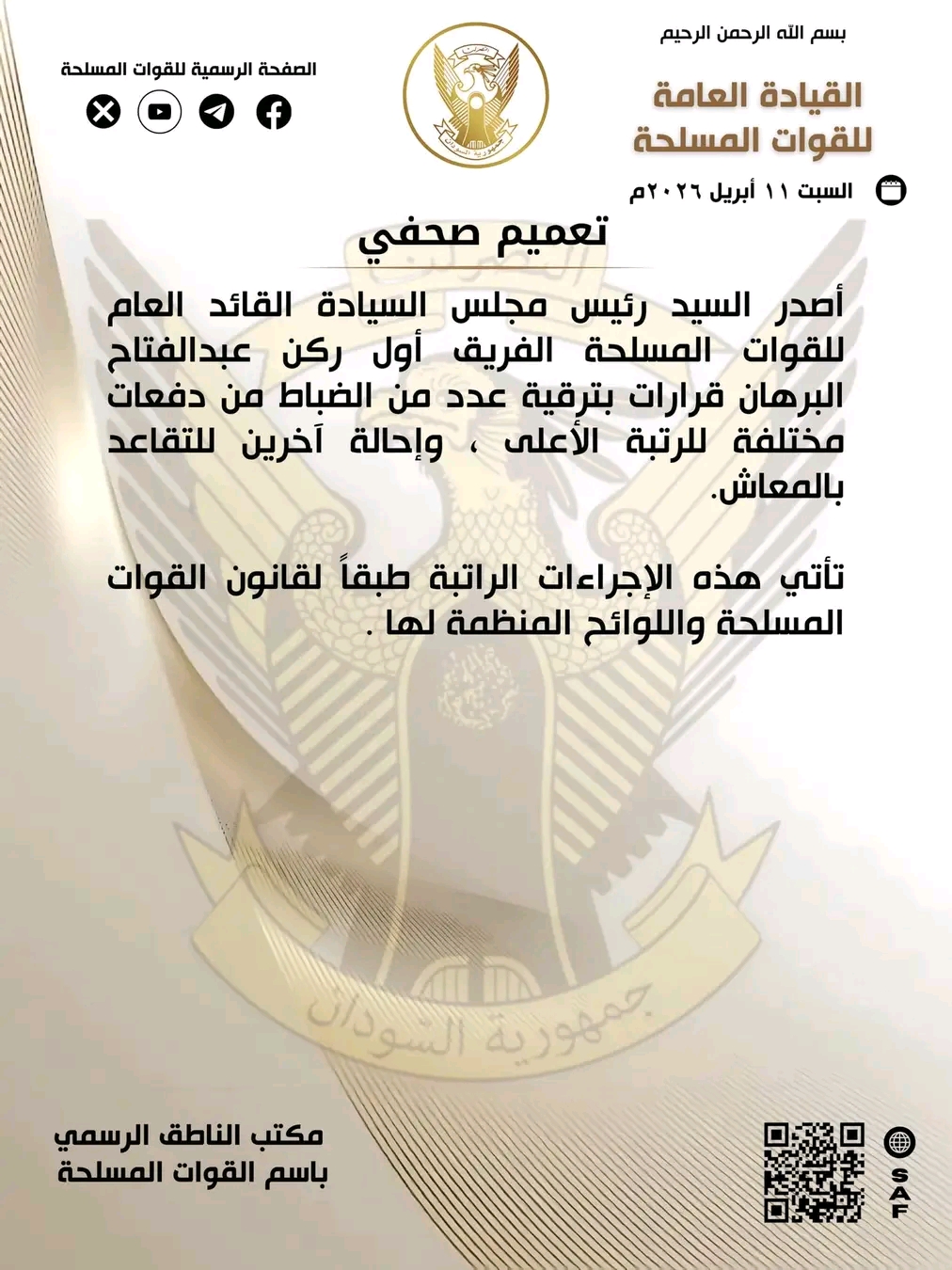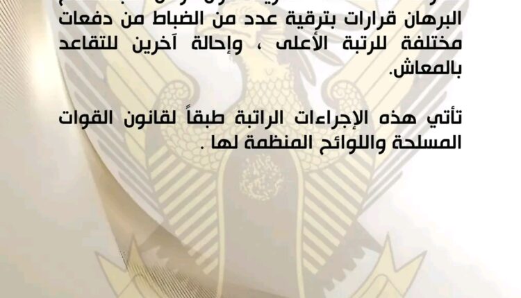 أصدر السيد رئيس مجلس السيادة القائد العام للقوات المسلحة الفريق أول ركن عبدالفتاح البرهان قرارات بترقية عدد من الضباط من دفعات مختلفة للرتبة الأعلى ، وإحالة آخرين للتقاعد بالمعاش.