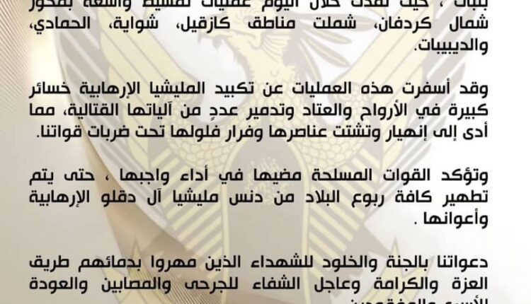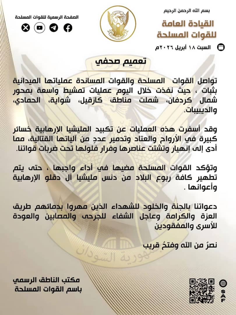 نفذت القوات المسلحة خلال اليوم عمليات تمشيط واسعة بمحور شمال كردفان، شملت مناطق كازقيل، شواية، الحمادي، والديبيبات،مواصلة لعملياتها الميدانية مع القوات المساندة لها.
