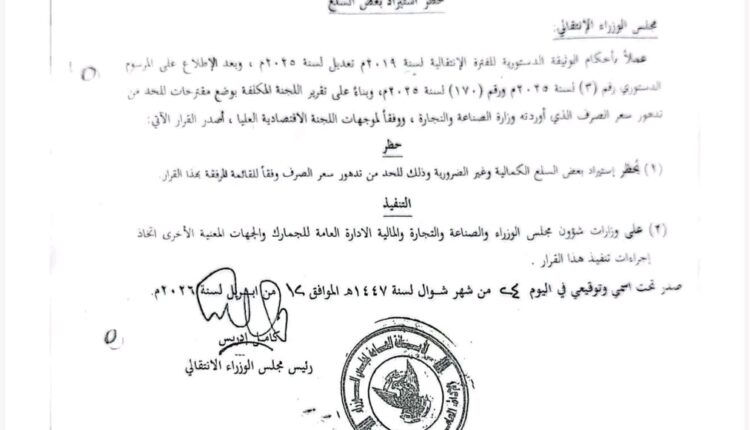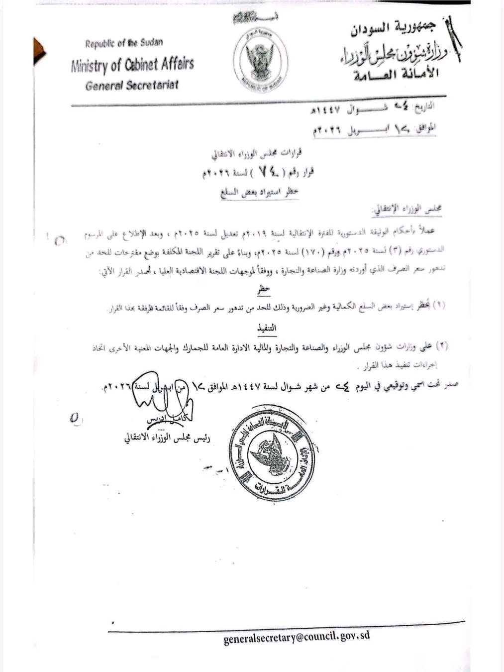 منشور رسمي بناء على توجيهات رئيس مجلس الوزراء كامل ادريس، بصدور قرار بحظر استيراد مجموعة من السلع لمدة ستة أشهر، وذلك بهدف حماية الاقتصاد الوطني وترشيد الاستيراد.