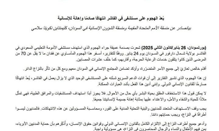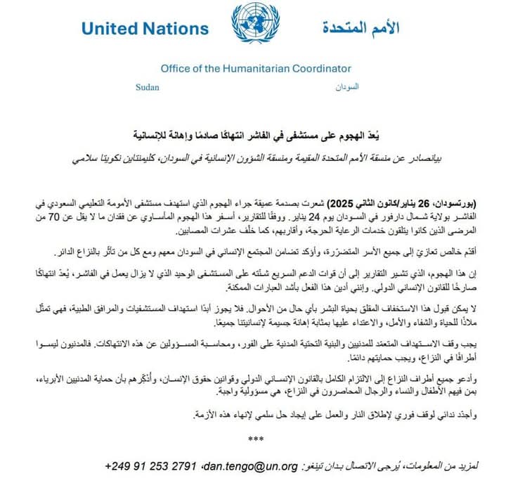 إستنكرت منسقة الأمم المتحدة المقيمة ومنسقة الشئون الانسانية بالسودان كليمنتان سلامي إستهداف المستشفي السعودي بالفاشر بشمال دارفور ، وقالت الإدانة تشمل المستشفيات والمرافق الطبية وقالت أن الهجوم عليها غير مقبول على الإطلاق ، مؤكدة أن هذه المؤسسات هي ملاذات للحياة والشفاء والأمل ، وقالت أن تدميرها يشكل إهانة لإنسانيتنا المشتركة .