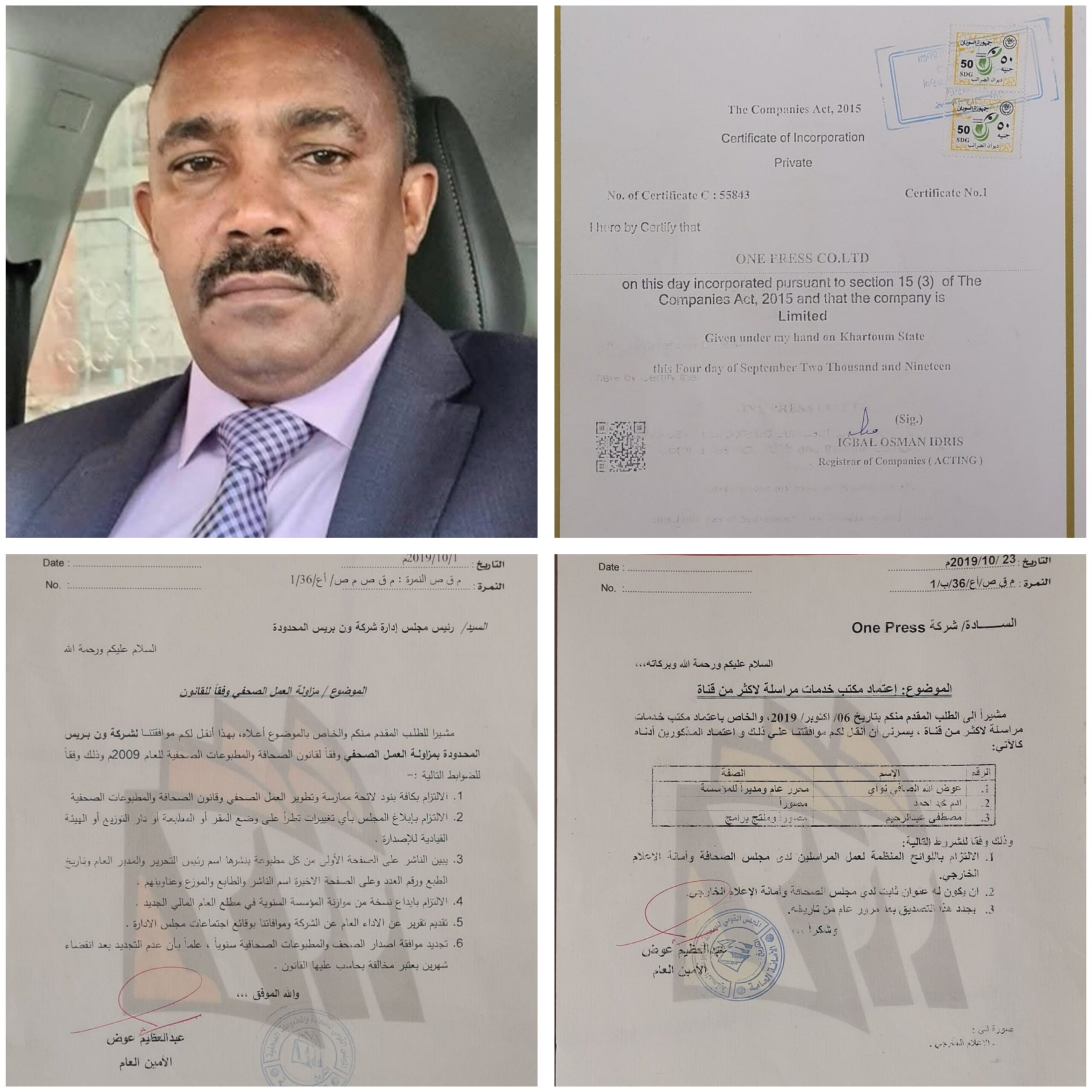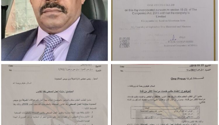 وكالة One Press هي جهة مسجلة رسميًا وفقًا لقانون الشركات السوداني لعام 2015، وتحمل شهادة تسجيل صادرة من مسجل عام الشركات بوزارة العدل، تحت رقم شهادة C:55843، بتاريخ 4 سبتمبر 2019.
