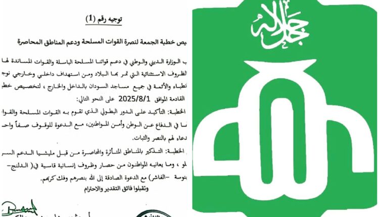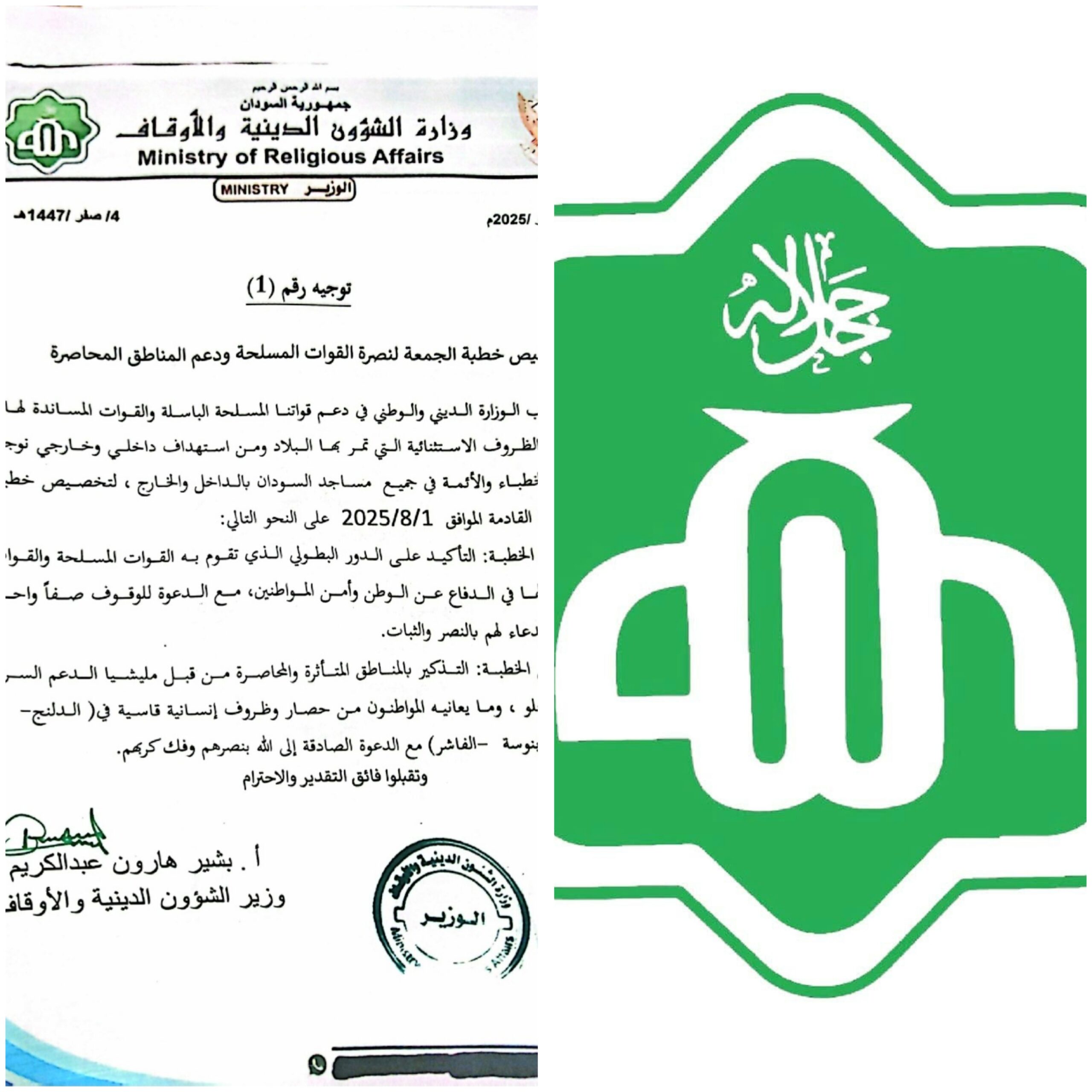 تحصلت (المدقاق الإخبارية) علي أول توجيه رقم (1) لوزير الشؤون الدينية والأوقاف الأستاذ بشير هارون عبد الكريم ، عقب تسلمه مهام عمله وجه اليوم الأربعاء 30 يوليو 2025 ، خطباء وأئمة مساجد السودان في الداخل والخارج تخصيص خطبة الجمعة المقبلة الأول من أغسطس المقبل لنصرة القوات المسلحة والقوات المساندة لها ودعم المناطق المحاضرة من قبل مليشيا الدعم السريع وشريكتها الحركة الشعبية شمال (عبد العزيز الحلو) في (الفاشر ، كادقلي ، الدلنج ، بابنوسة) ، حيث يعيش المواطنين حصار وظروف إنسانية قاسية مع الدعوة الصادقة إلى الله بنصرهم وفك كربهم.