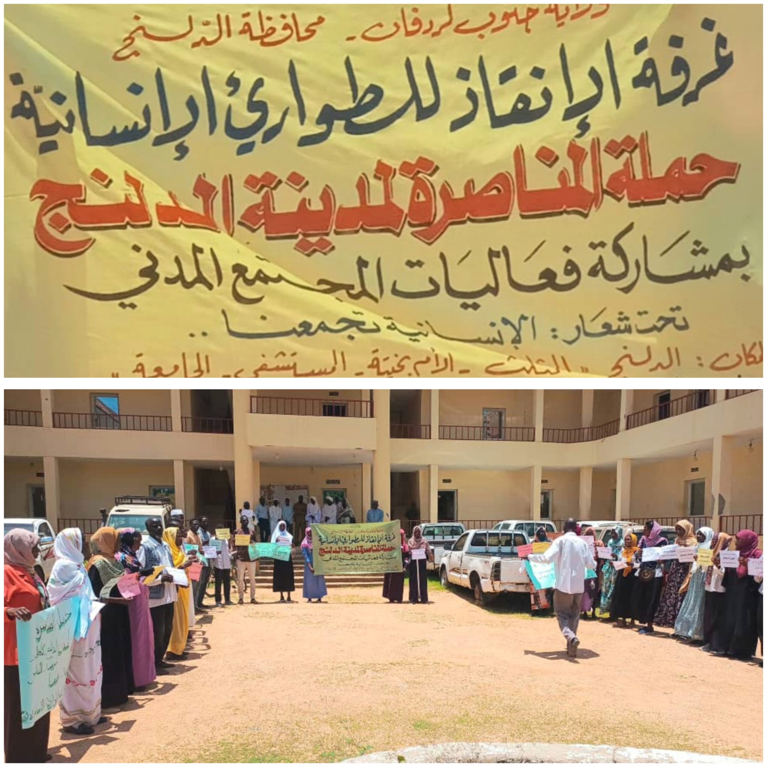 بعثت المنظمات والمبادرات اامحتمعية والجمعيات الخيرية والطوعية والنسوية والمؤسسات وشركاء المؤسسات الإنسانية والاجتماعية الخدمية والإدارة الأهلية ورجال الدين الإسلامي والمسيحي والتي تنضوي جميعها تحت مظلة غرفة الإنقاذ للطوارئ الإنسانية ، بعثت بنداء إستغاثة من مدينة الدلنج المحاصرة إلى رئيس مجلس السيادة الفريق أول ركن عبد الفتاح البرهان وأعضاء المجلس ورئيس مجلس الوزراء البروفسير كامل الطيب إدريس ومفوض العون الإنساني الاتحادي سلوى بنية ، ووالي جنوب كردفان محمد إبراهيم عبد الكريم لجنة امن الولاية والأمم المتحدة وكل الوكالات والمنظمات الدولية والإقليمية .