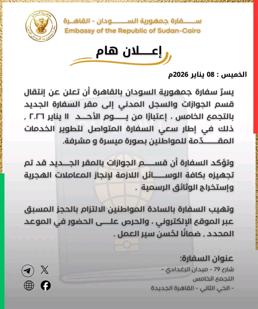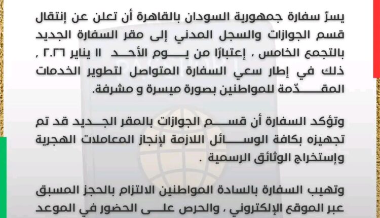 أعلنت سفارة جمهورية السودان بالقاهرة عن انتقال قسم الجوازات والسجل المدني إلي المقر الجديد بالتجمع الخامس ابتداء من يوم الاحد ١١ يناير وذلك في إطار سعي السفارة لتقديم الخدمات بكل يسر وسهولة .